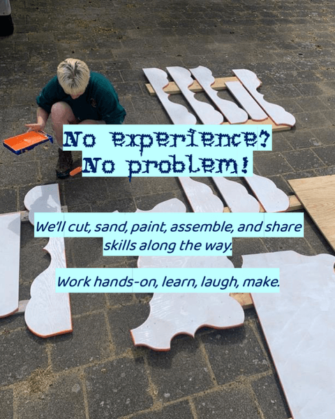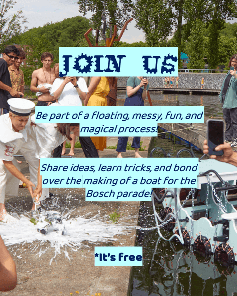 From March until June 2026, Le Bateau Duo hosts a participatory worksite at the Buurtwerkplaats Noorderhof to build their new floating sculpture for the Den Bosch Parade 2026. Over the three months, participants work on cutting, building, sanding, painting, assembling, and all the many tasks the building entails.