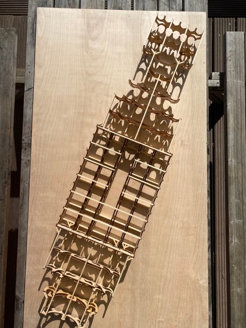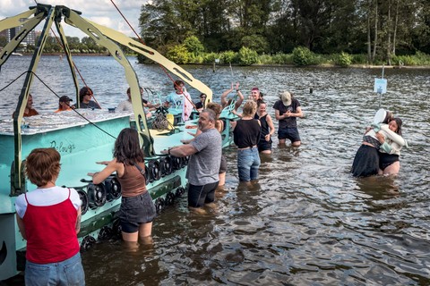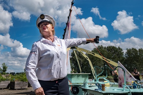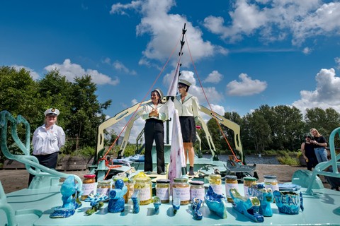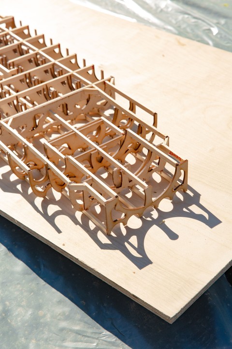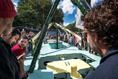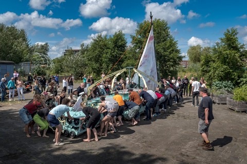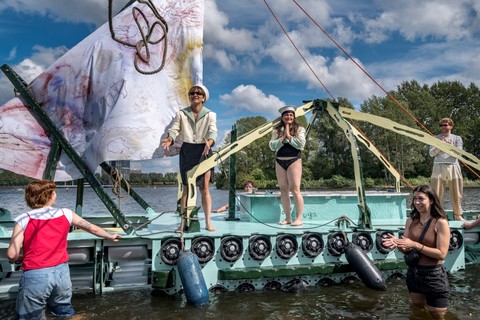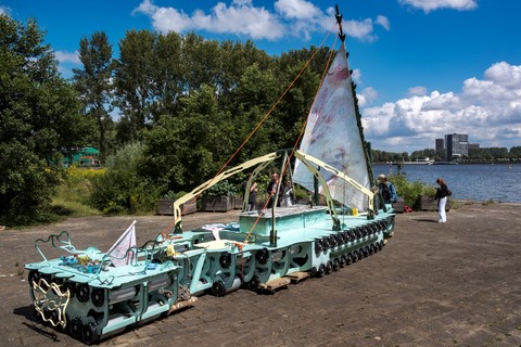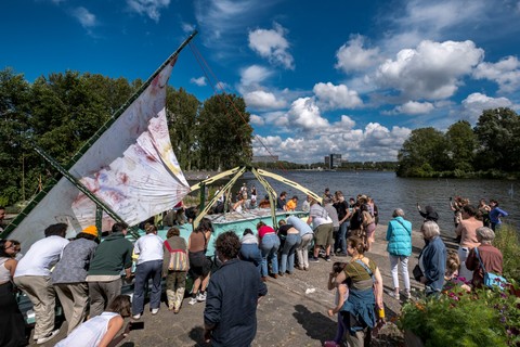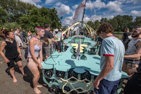 Belouga was built between April and July 2024 at the Buurtwerkplaats Noorderhof, with the support of Amsterdam750 and the Talent Development program of the Stimulerings fonds. The ship has been constructed collectively as a collaborative work site. No previous experience was needed, the main idea being to share skills, knowledge, learn and make together. Everyone was welcome, we gave priority and special space for women and the queer community. Alongside the worksite, we invited artists every first Sunday of the month the share their craft and add their touch to the vessel.